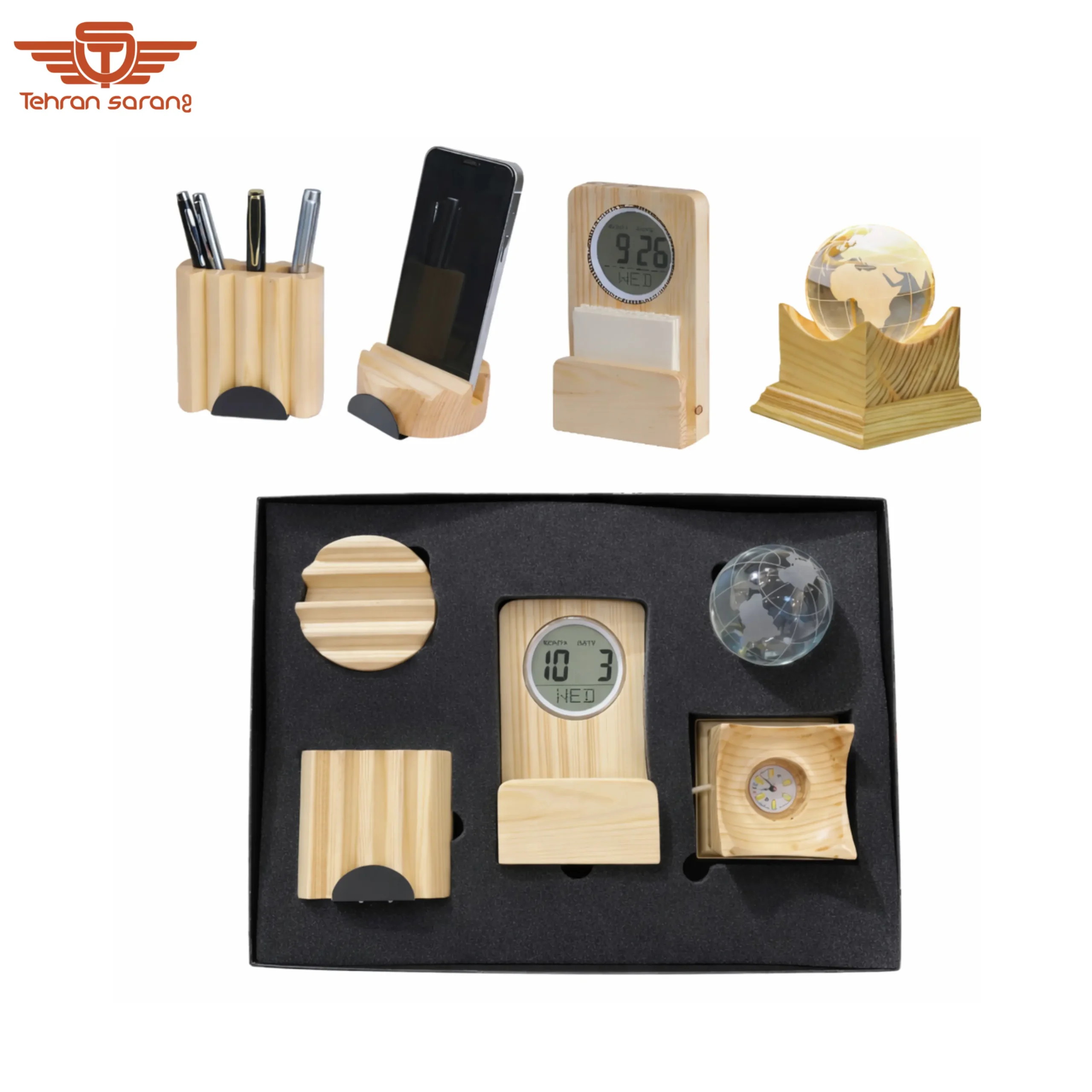 شامل ساعت رومیزی دیجیتال، گوی یادداشت، جای موبایل و جای خودکار