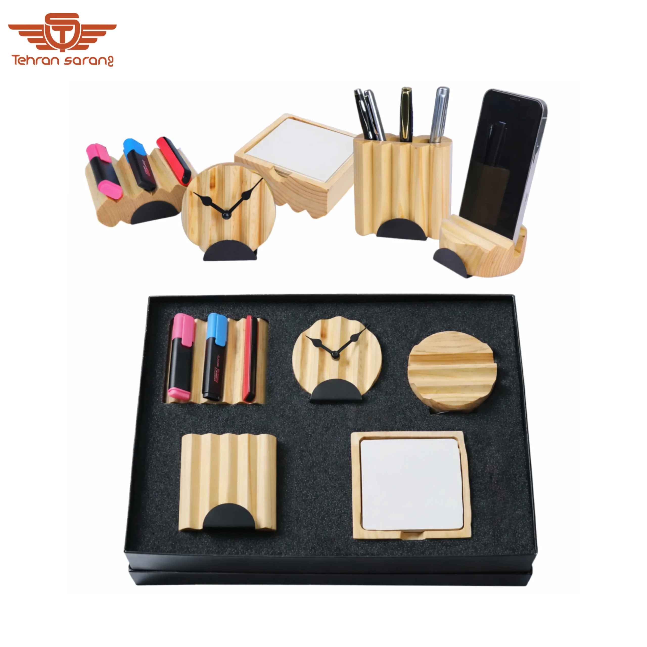 شامل ساعت رومیزی، جا یادداشتی، جاموبایلی و جای ملزومات اداری